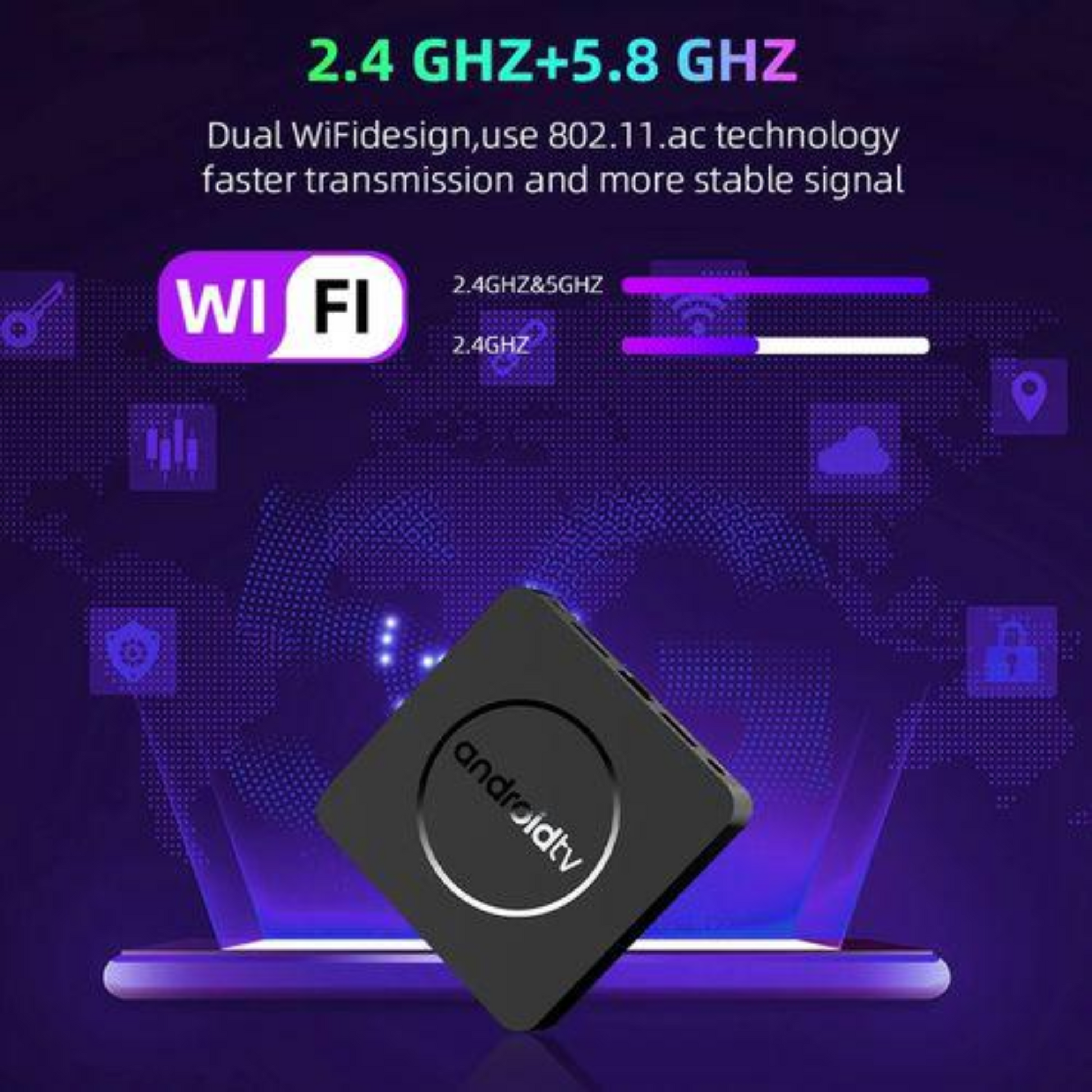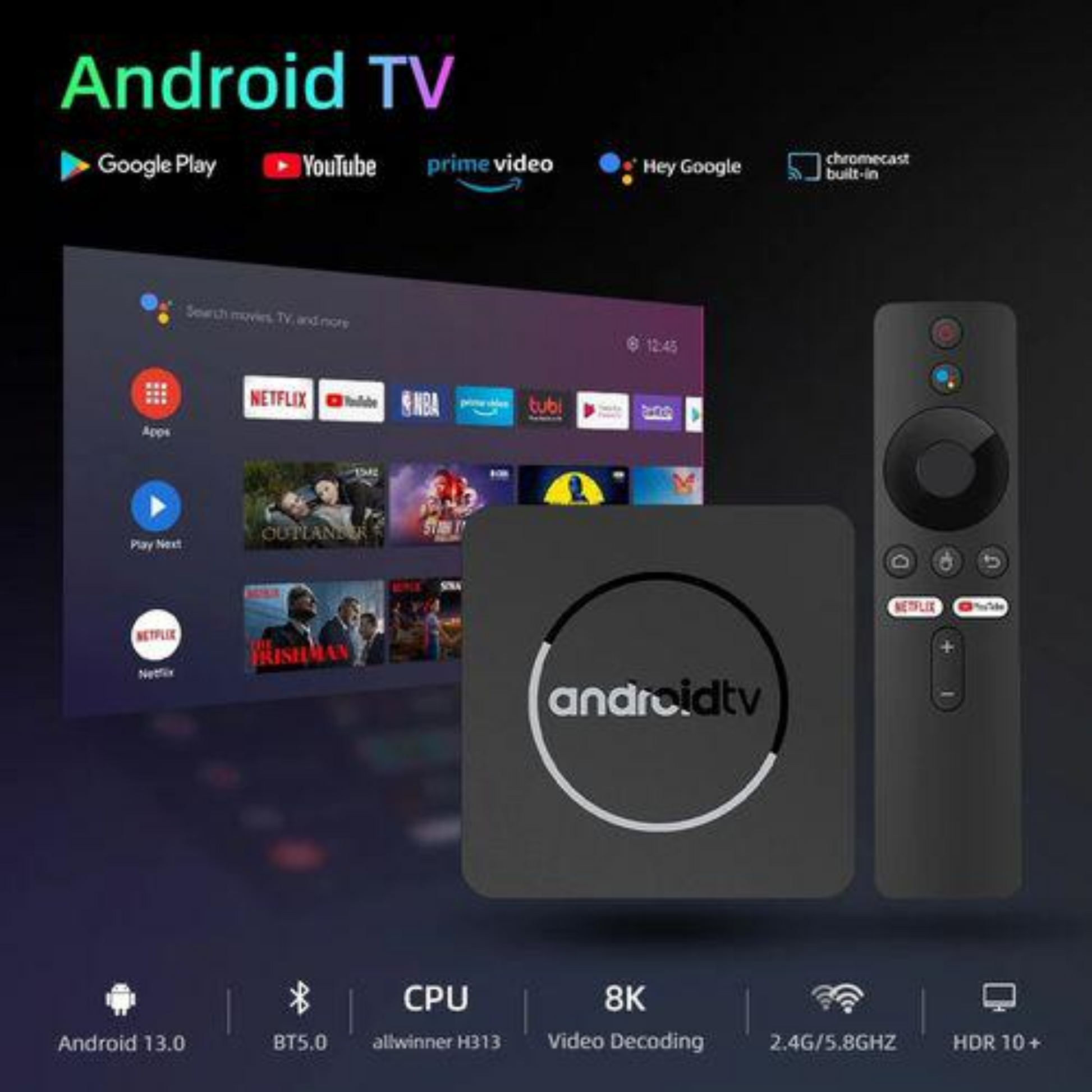 Funksione të Pasura, Aplikime të Shumta: Punon me sistemin operativ Android TV 13.0, kompatibil me shumë aplikacione dhe lojëra për të përmbushur çdo nevojë argëtimi. Mbështet WiFi 2.4G/5G për lidhje të qëndrueshme, Bluetooth 5.2 për lidhje me periferikë.