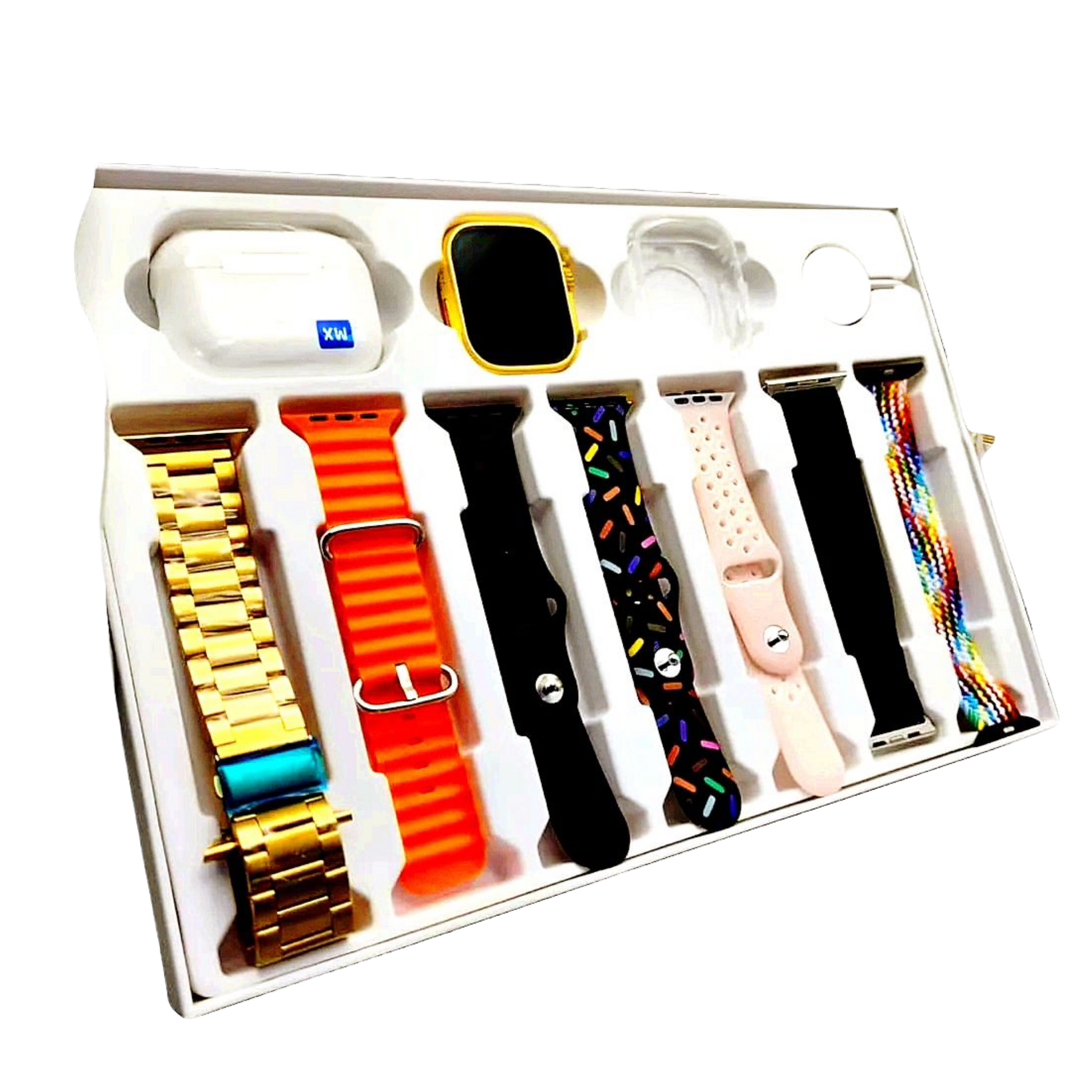 Paketë 10 në 1: Përfshin smartwatch, kufje wireless, 7 grupe, mbrojtëse ekrani dhe karikues wireless.